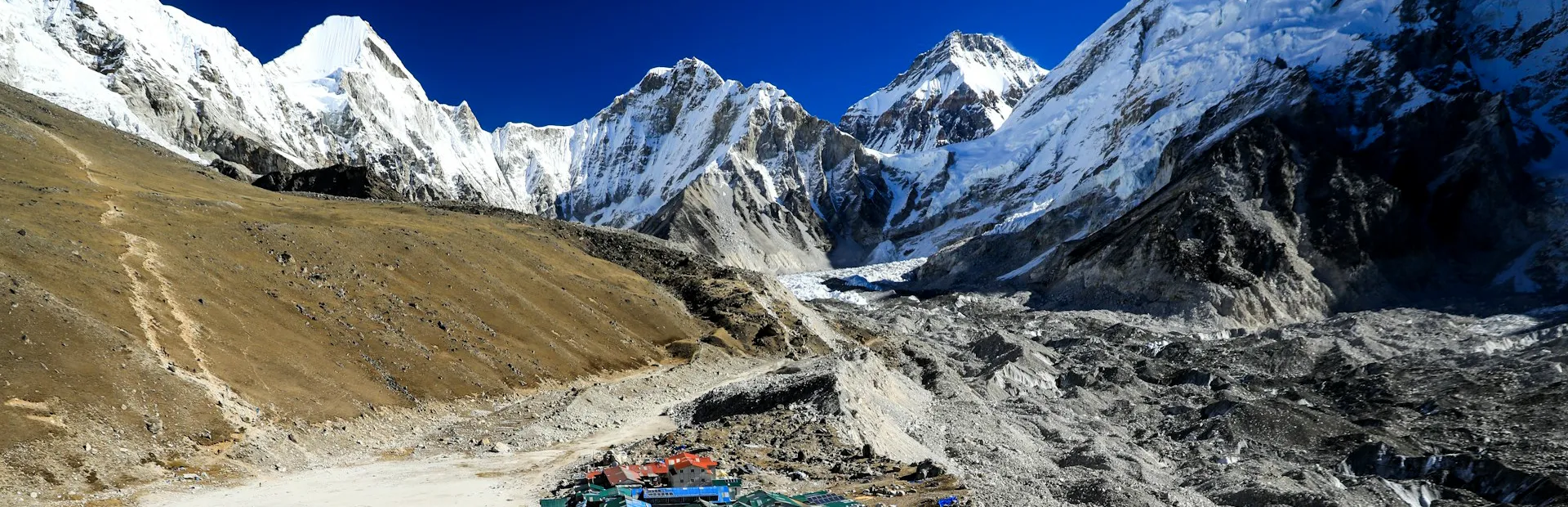 Next, a straight vertical ascent along the Changri Glacier awaits us as we near Gorakshep. This is a very sandy and desolate area with few shelters for the trekkers of the Everest Base Camp trek.